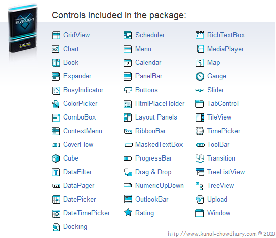 Before that, let’s have a look into the product. Here are the controls those are included into the package and these are all custom controls built on top of the default Silverlight controls with additional features.